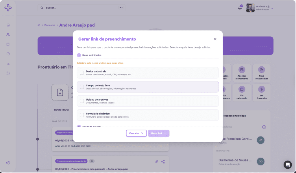 No perfil do paciente, clique em Solicitar preenchimento, selecione os itens, escreva a mensagem (se quiser), gere o link e envie — inclusive via WhatsApp.